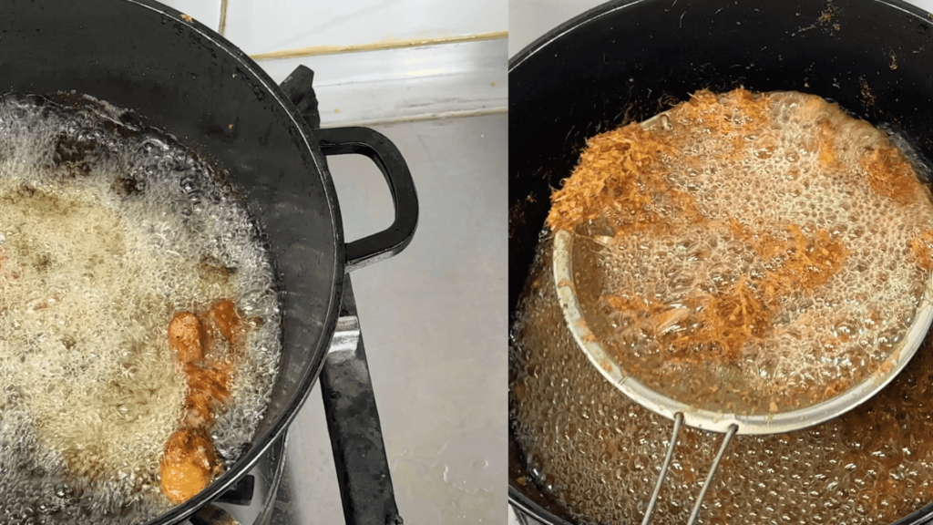 3.Angkat pisahkan ayam dengan lengkuasnya tiriskan sampai tidak berair.goreng ayam terlebih dahulu lalu,goreng lengkuasnya terpisah sampai warnya berubah warnah Coklat.