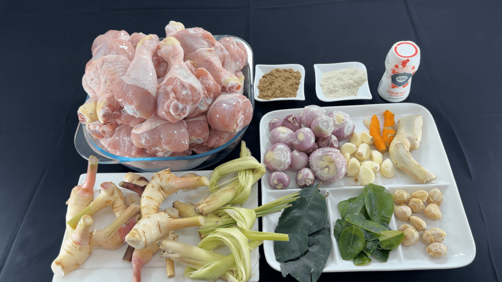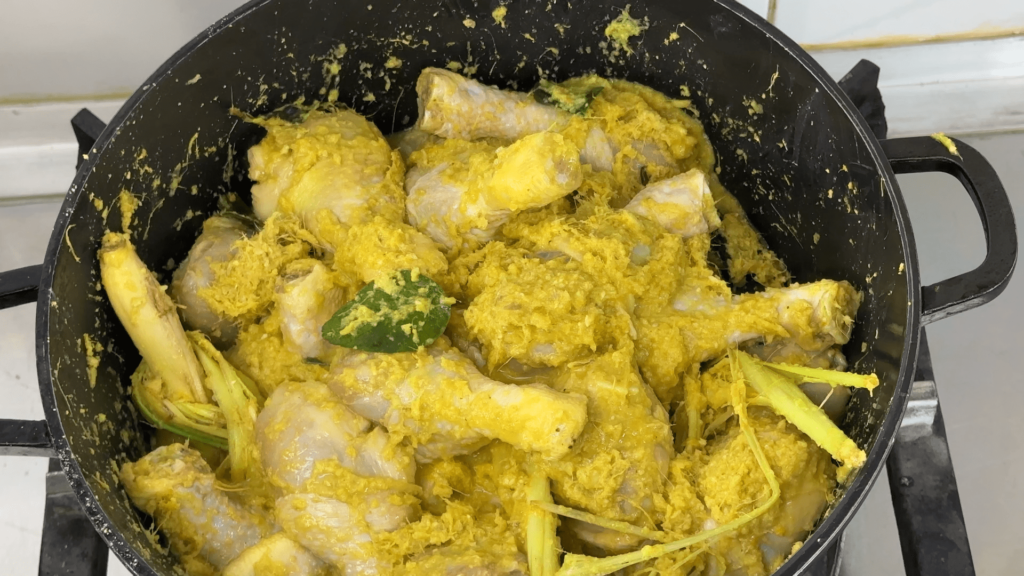 2.Masukkan bumbu yang sudah dihaluskan kedalam panci.masukkan lengkuas beserta serei,daun salam, dan daun jeruk,paha ayam yang sudah dibersihkan,garam dan penyedap rasa(optional),tambahkan air,ungkep hingga air habis.
