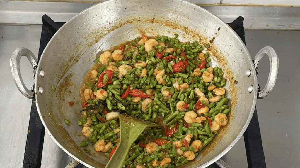 2.Masukan udang,masak sampai berubah warna,masukan cabe besar,masukan buncis tumis sampai mateng