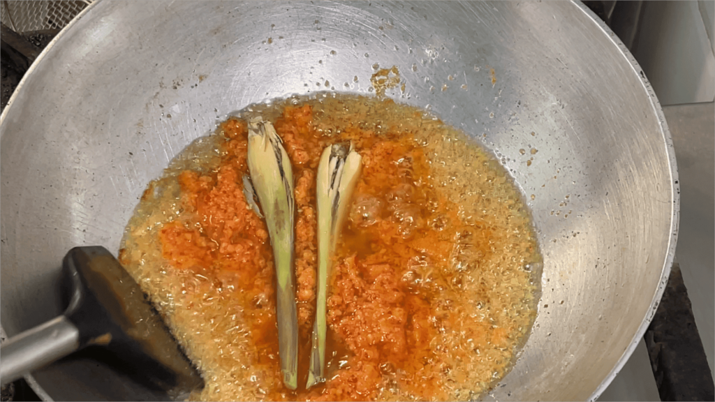 2.Siapkan wajan.minyak secukupnya tumis bumbu halus,masukan sereh,tumis hingga harum,