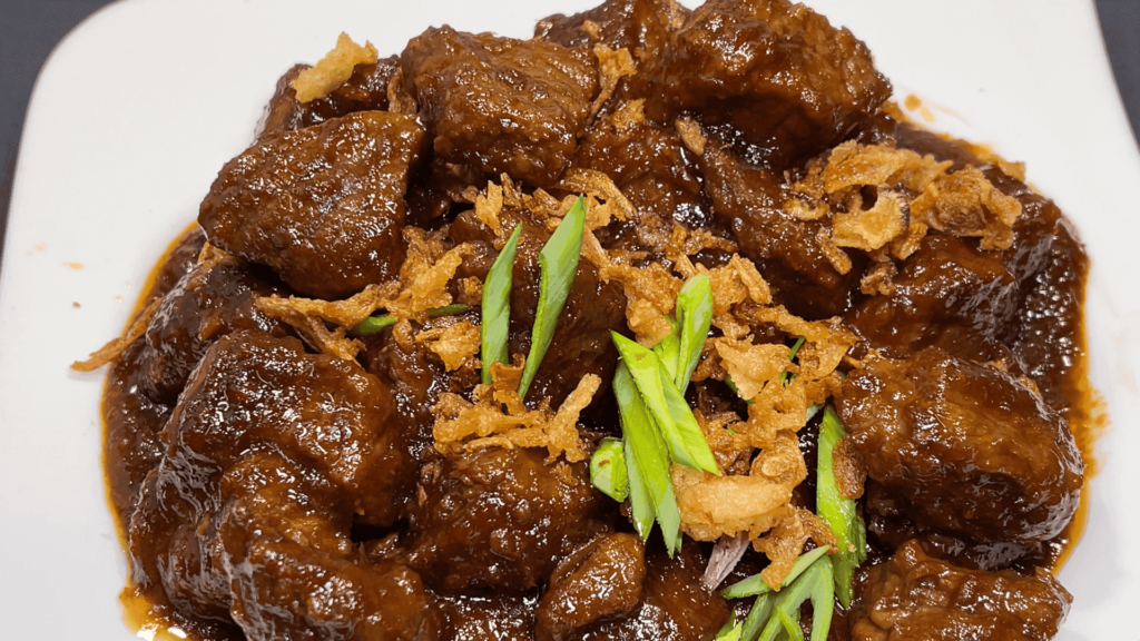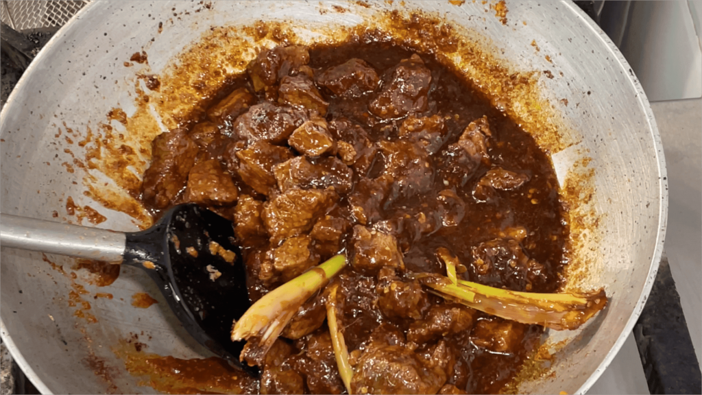 3.Bumbu mateng masukan lada,gula merah,garam secukupnya,asem jawa,dan masukan daging sapi,dan kecap.masak sampai kuah mengental.