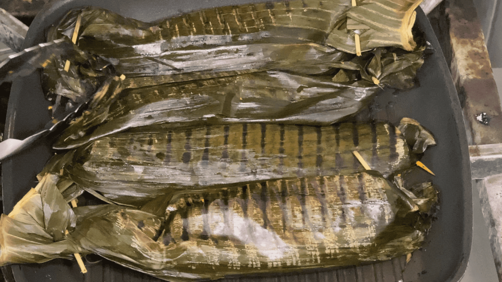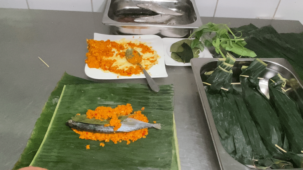 2.Siapkan daun pisang,letakan bumbu.juga diatas ikan.tambahkan daun salam,dan kemangi,tutup atau gulung bersama daun pisang.eratkan dengann tusuk gigi.