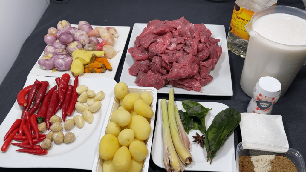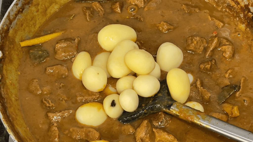 3.Tumis bumbu halus dengan api sedang,setelah bumbu harum masukan daun salam,daun jeruk,bunga lawang dan sereh,tumis sebentar masukan ketumbar,merica dan pala.tumis sampai bumbu harum,masukan daging.ratakan,masukan santan,masak dengan api kecil sampai daging empuk.masukan garam, dan kentang,masak sampai kentang empuk.