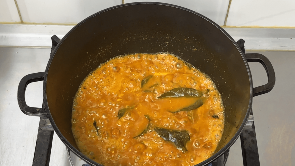 2.Tumis bumbu halus,masukan lengkuas,daun salam,daun jeruk,tumis sampai harum,tambahkan kaldu bekas rebusan daging,gula,garam,asem jawa.