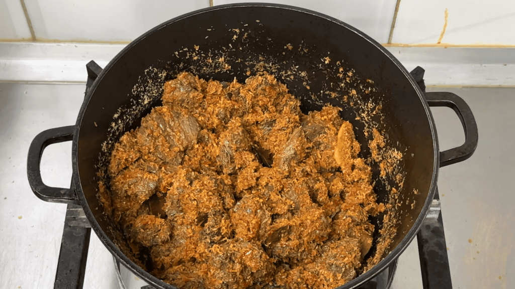 3,.Masuakan daging ratakan,tambahkan kelapa,ratakan