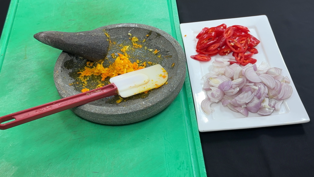 2.Haluskan bawang putih dan kunyit,iris bawang merah dan cabe besarnya