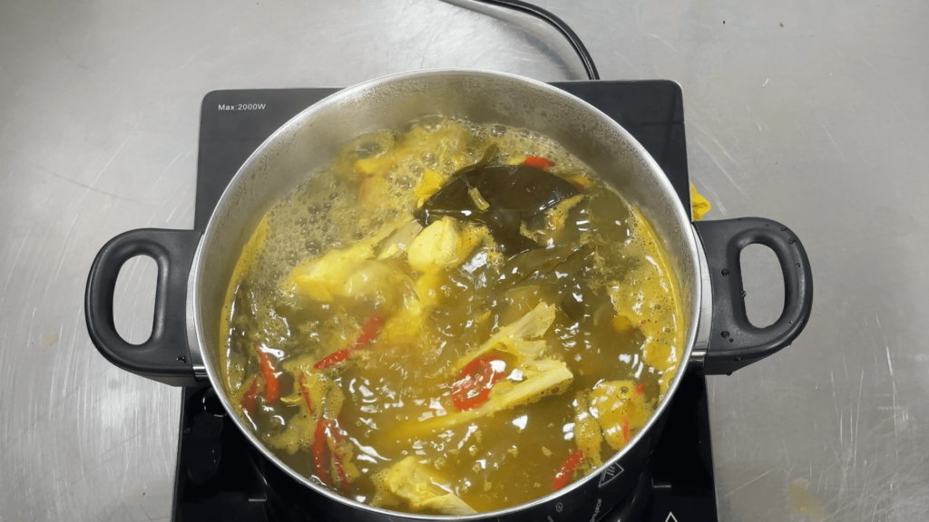 3.Masukan air dipanci secukupnya,masukan bumbu halus,setelah beberapa saat masukan bawang merah dan cabe besar,juga daun jeruk dan daun salam laos,sereh dan jahe,ketumbar,asem,gula,garam,dan penyedeap rasa.masukan kepala ikan